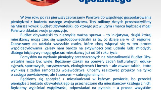 Marszałek Andrzej Buła wystosował list do mieszkańców województwa opolskiego, zachęcający wszystkich do udziału w pierwszej edycji Marszałkowskiego Budżetu Obywatelskiego.