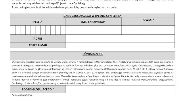 Głosować można przez wrzucenie karty do urny w Urzędzie Marszałkowskim Województwa Opolskiego i w punktach informacyjnych, elektronicznie oraz korespondencyjnie na adres UMWO: